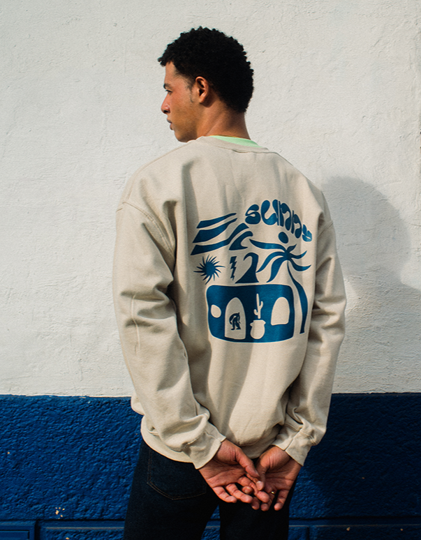 El buzo cuello redondo beige Bahía Morada cuenta con un estampado 100% hecho en la técnica artesanal de serigrafía. Queremos que esta prenda te transporte directamente a las relajantes vibras de una casa playera. Creada con inspiración en el espíritu costero, este buzo te envuelve en el fresco y sereno ambiente que genera la brisa marina y la tranquilidad.